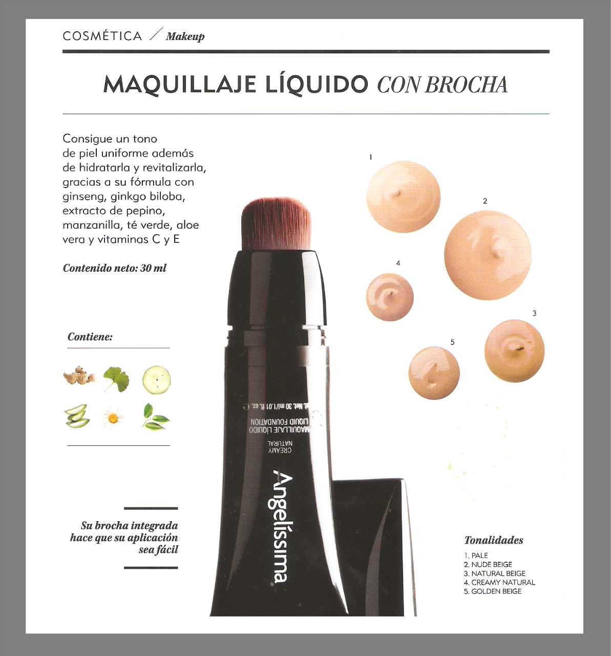 Fornisce una copertura equilibrata e senza brillo sulla pelle, lasciando una finitura liscia come la seta, che aiuta a nascondere le imperfezioni della pelle. È formulato con ginseng, tè verde e vitamina E, oltre a estratti di cetriolo, aloe vera e camomilla. Il pacchetto include un pennello per una facile applicazione ed evita il contatto diretto con il prodotto. E 'ideale per tutti i tipi di pelle.