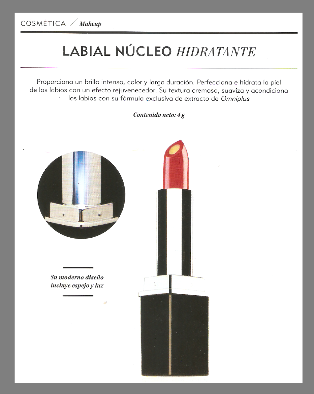 "La bellezza, l'idratazione e la nutrizione" texture cremosa, ammorbidisce le labbra, la sua luminosità è intensa e di lunga durata. Il suo nucleo contiene estratto idratante Omniplus, uno dei prodotti star della Omnilife. Fornisce un ulteriore un'altra protezione alle tue labbra e offre altre tonalità di moda per le tue labbra.