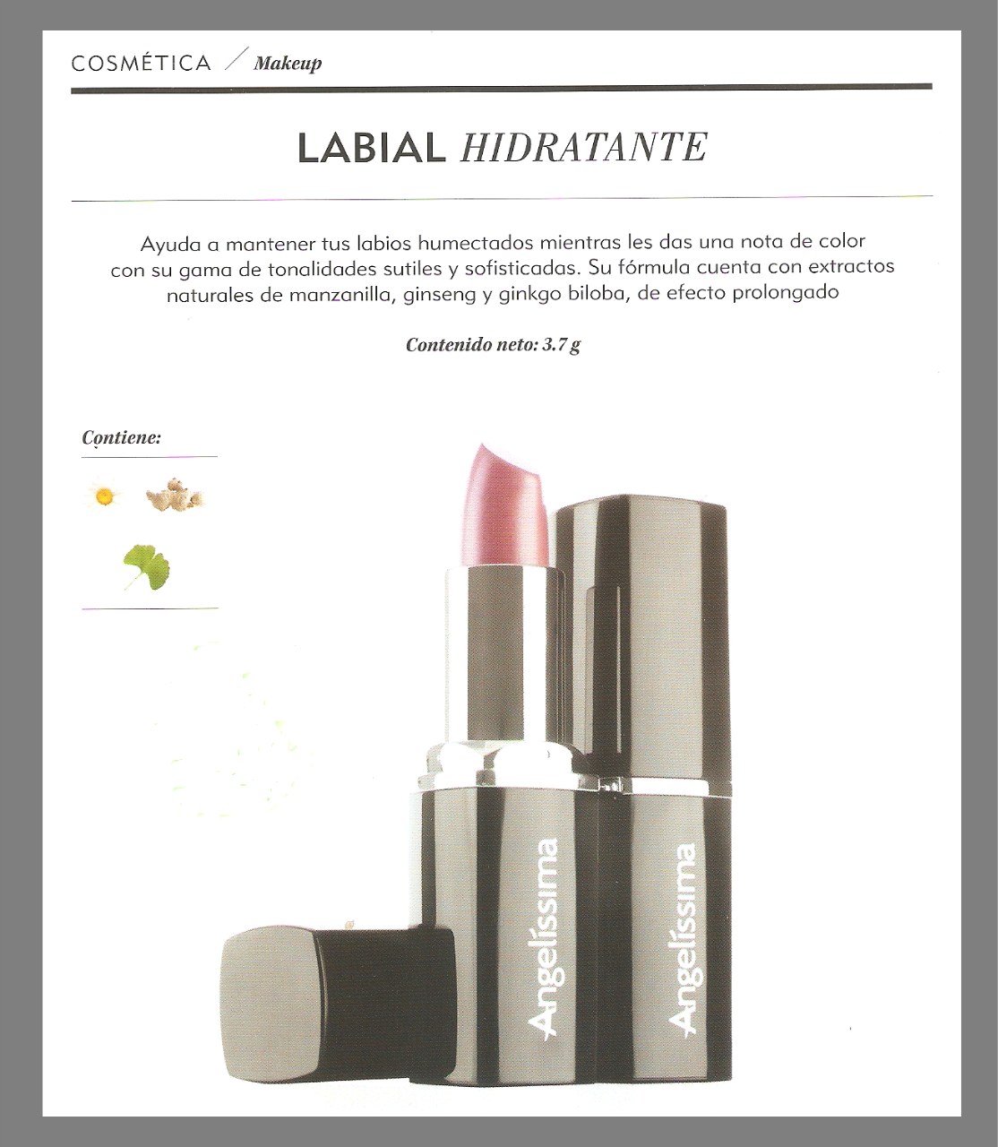 Belle labbra e idratata grazie alla formula idratante. La formulazione di questo rossetto che idrata e protegge le labbra, contiene estratti naturali come estratto di camomilla, ginseng e gingko biloba, come emollienti come il caprilico, mantenendo le labbra idratate, dando un tono speciale di tua scelta.